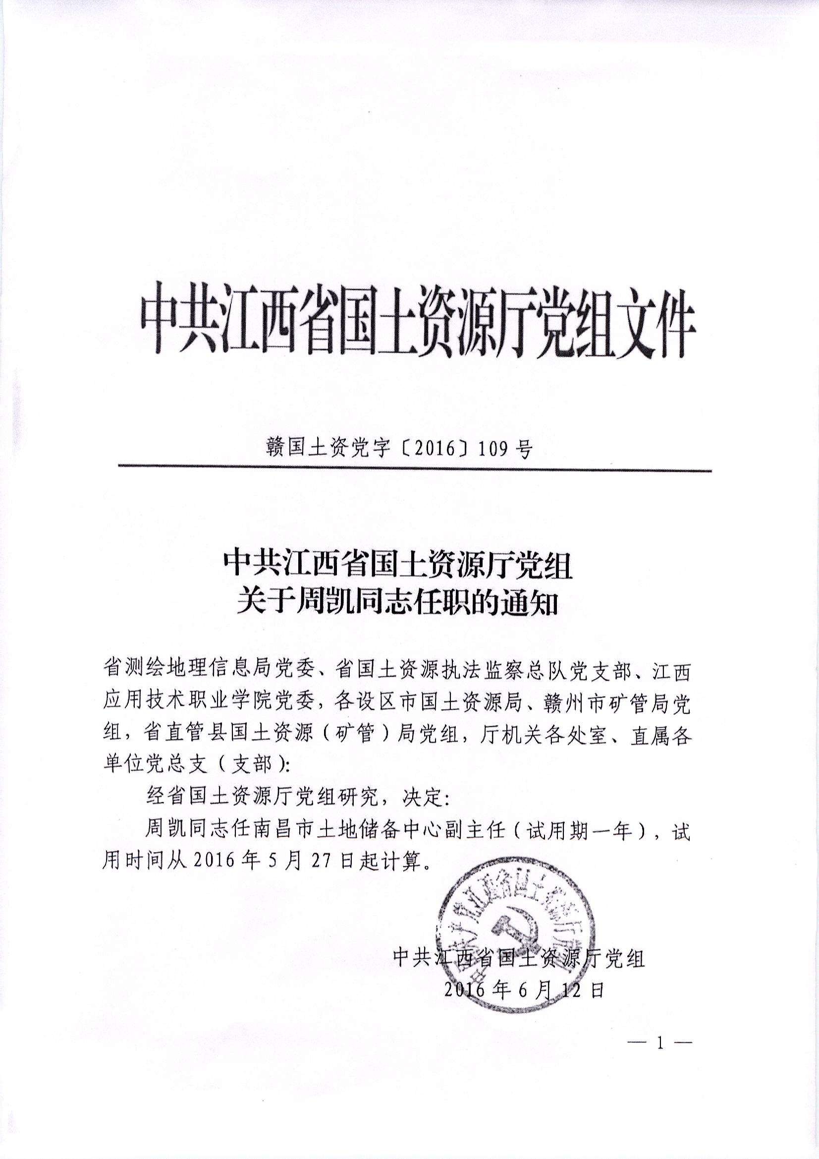 中共江西省国土资源厅党组关于周凯同志任职的通知