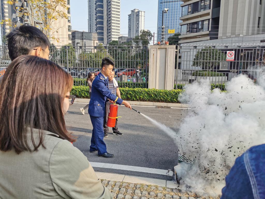 讲座结束后,各分中心、中心各处室的综治联络员跟随刘指导员来到户外空旷场地开展灭火演练,刘指导员现场为大家演练干粉灭火器的操作规程及如何进行火灾应急处理,各综治联络员有序地进行了灭火器的实际使用操作。