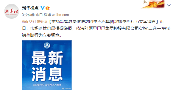 近日,市场监管总局根据举报,依法对阿里巴巴集团控股有限公司实施“二选一”等涉嫌垄断行为立案调查。