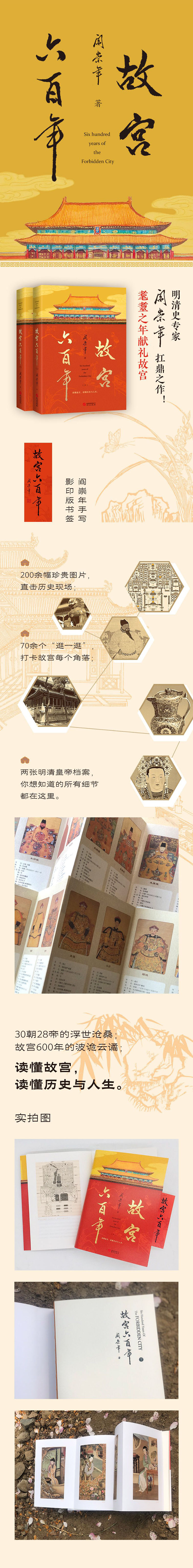 故宫无与伦比的宫殿气象,历经六百年风霜,依旧熠熠生辉。故宫的建筑、藏品、人物三者以及其他元素的互动、演绎,成为故宫六百年的历史。本书共100讲,分6个章节,精选200余幅图片,以时间为线索,将明清600多年历史从头细细捋来,分别讲述明代故宫、清代故宫、民国故宫和新中国故宫四个时期的历史,从明永乐十八年(1420年),一直到2020年,再现了故宫整六百年的风云变幻。