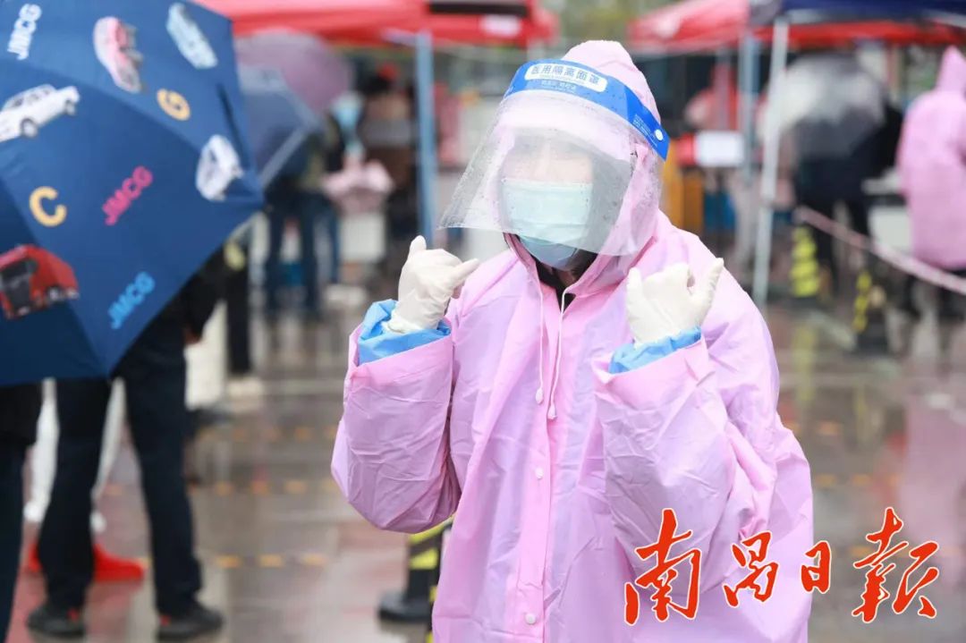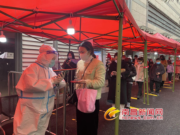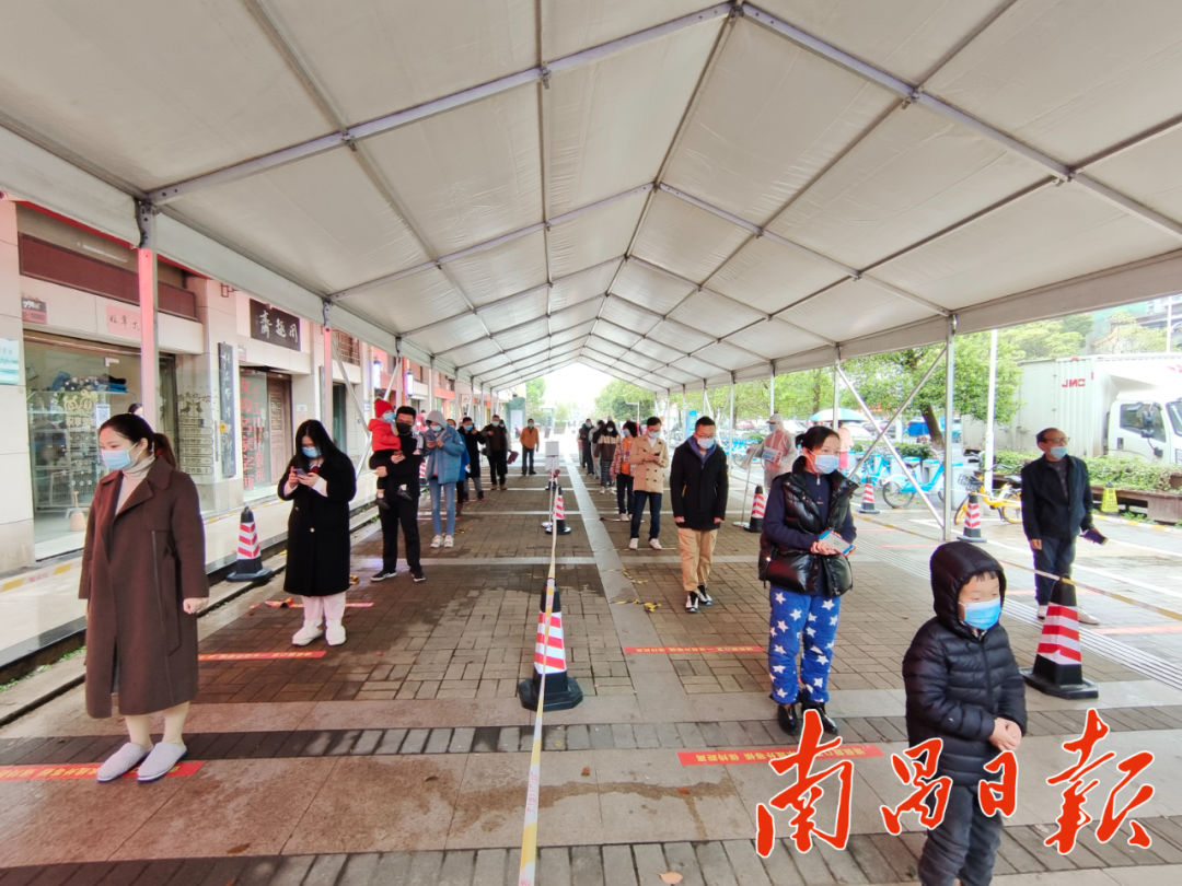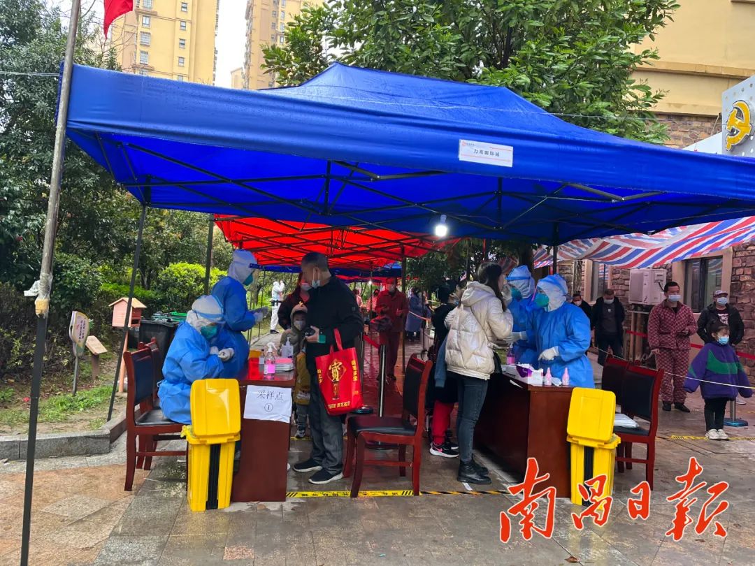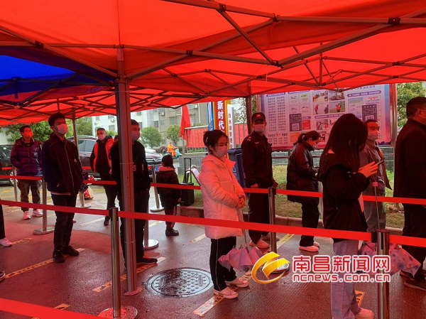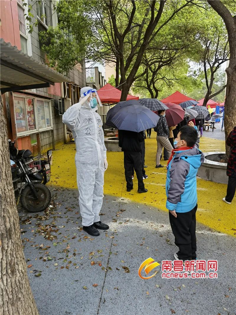 3月21日上午,在南昌县八月湖街道力高国际城核酸检测点,现场搭起了长长的雨棚,“雨棚是我们结束第二轮核酸检测工作后开始搭建的,我们淋湿不要紧,核酸检测不能停,也不能让居民淋雨。为了提高效率,我们会通过居民微信群,提前通知不同楼栋的居民在不同的时间段下来做核酸检测,错峰检测。”熊成明说。
