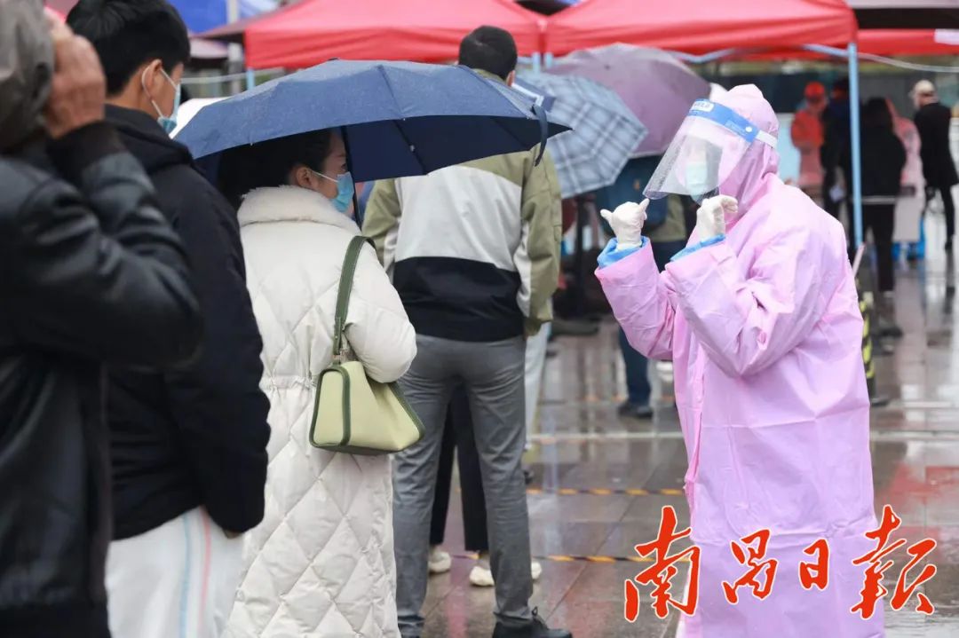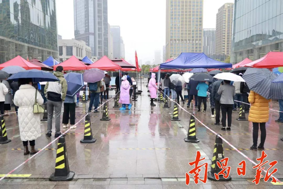 3月21日,在西湖区朝农街道五坊社区内,上午八点核酸检测采样工作正式开始,居民打着伞前来做检测,并保持一米距离,秩序井然。