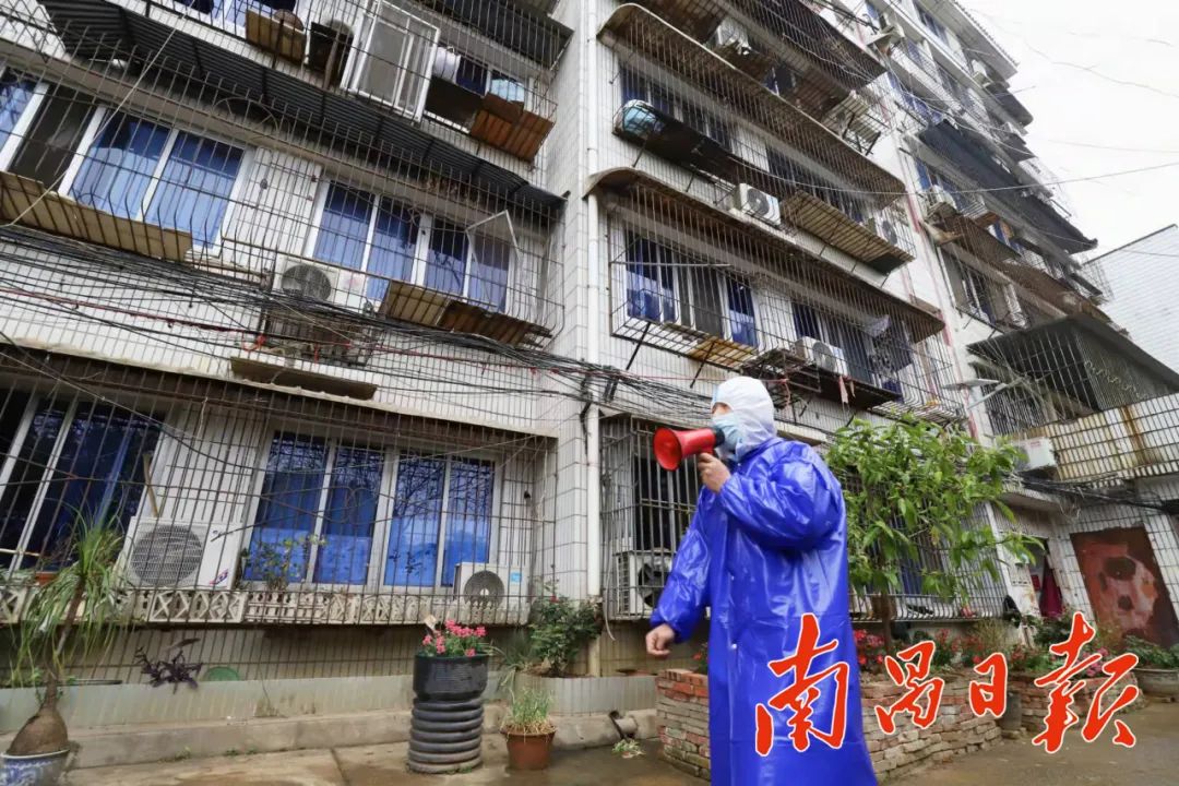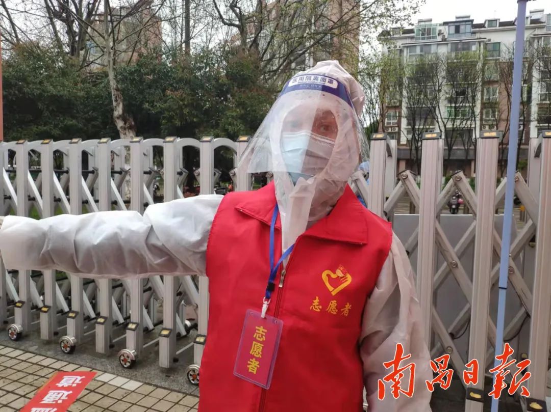 3月21日上午8点多,公园街道永宁社区71号庭院内,居民们陆续来到核酸检测采样点排队采样。在“爱心帮扶通道”旁,志愿者付菊香正在帮助几位老人用手机查询“昌通码”:“婆婆您不要急,我帮这位公公查好就帮您查,请您在一米线外稍等。”尽管她身着防护服,但额前几缕头发还是从帽子里跑了出来,被雨水打湿,湿漉漉地贴在脸颊上。付菊香和爱人朱伊莎是71号庭院6栋5单元的退休居民,全市较大范围区域核酸检测开始后,社区广泛征集志愿者,两口子第一时间就报了名。