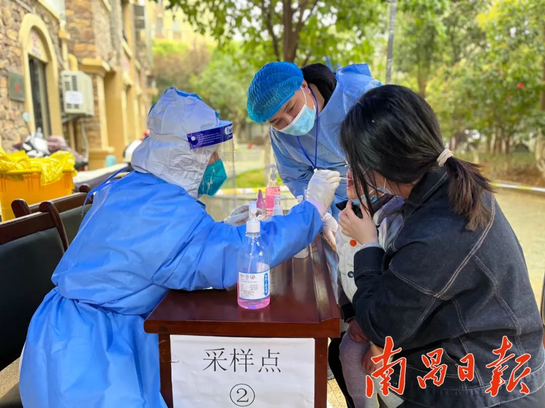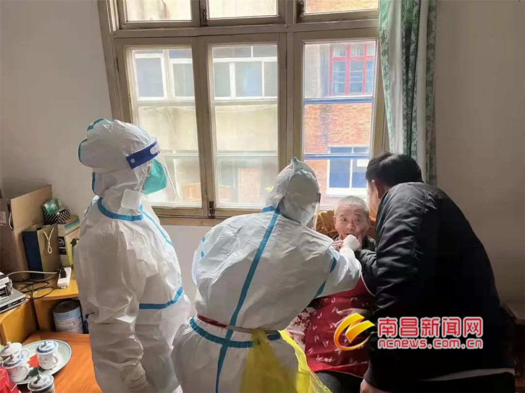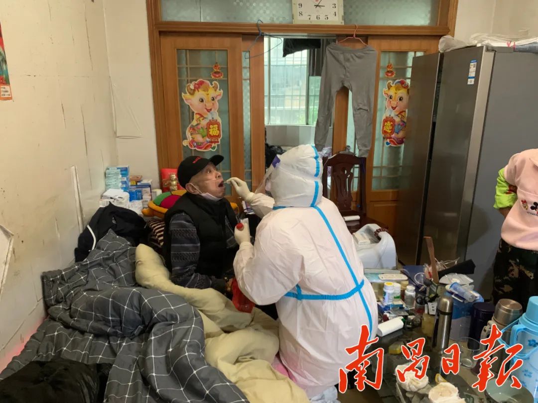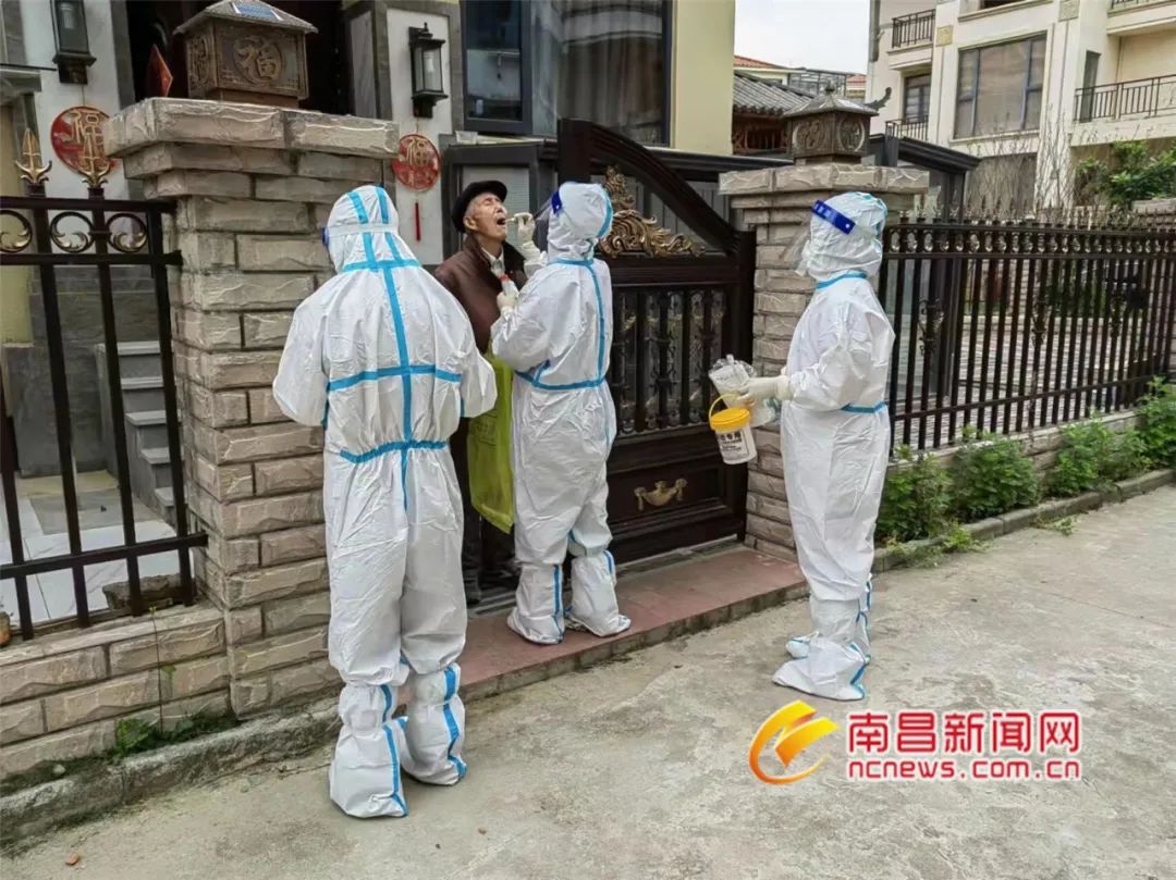 3月21日下午,在豫章街道滨江社区,一群身穿白色防护服的医护人员穿梭在各小区楼栋之间,爬楼入户,为行动不便、年事已高的特殊困难群体开展核酸检测上门服务。只见他们快速取样、动作麻利,尽量减少居民的不适感。