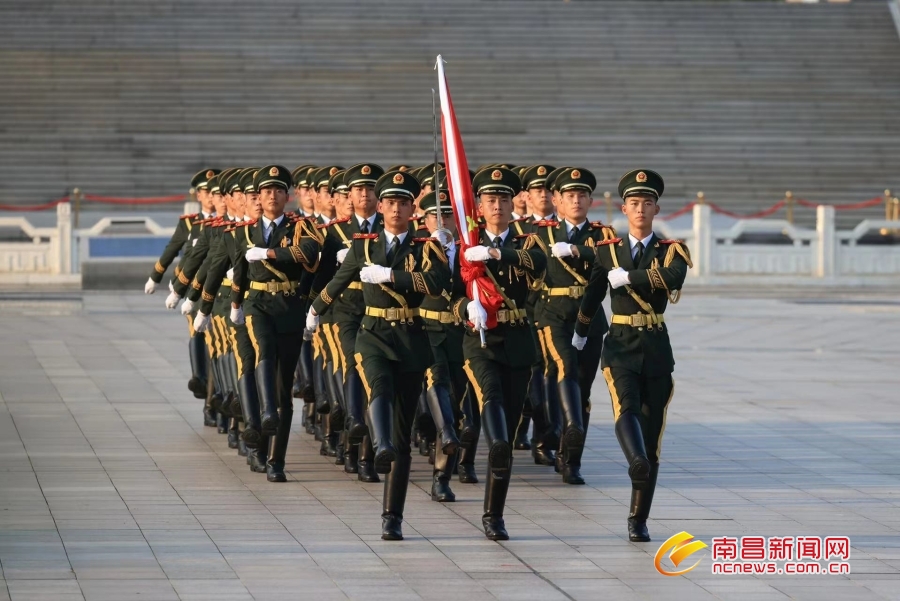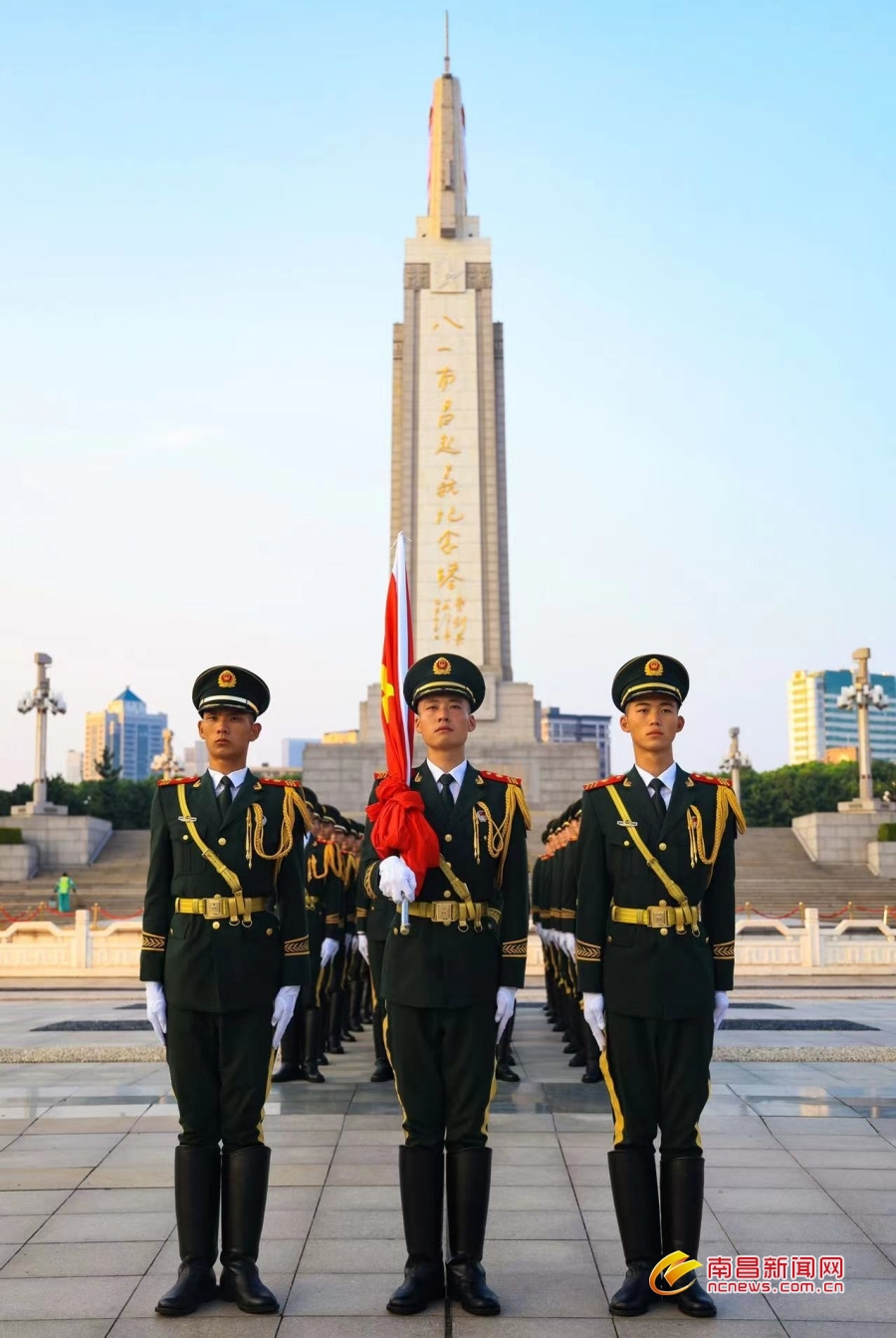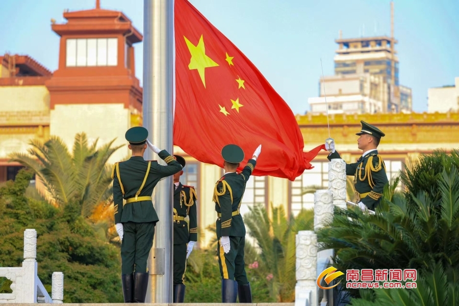 8月1日上午6时30分,铿锵的脚步声在八一广场响起,由武警南昌支队官兵组成的国旗护卫队踏着正步步伐向国旗台行进。“向国旗——敬礼!”,伴随着响亮的口令,护旗队员和礼兵行礼,八一广场奏响《义勇军进行曲》,升旗手高高扬起国旗,鲜艳的五星红旗迎风招展,在全场庄严的国歌声中缓缓升起。万人齐聚八一广场,见证五星红旗冉冉升起的庄严时刻,庆祝中国人民解放军建军95周年。