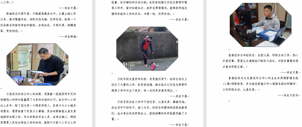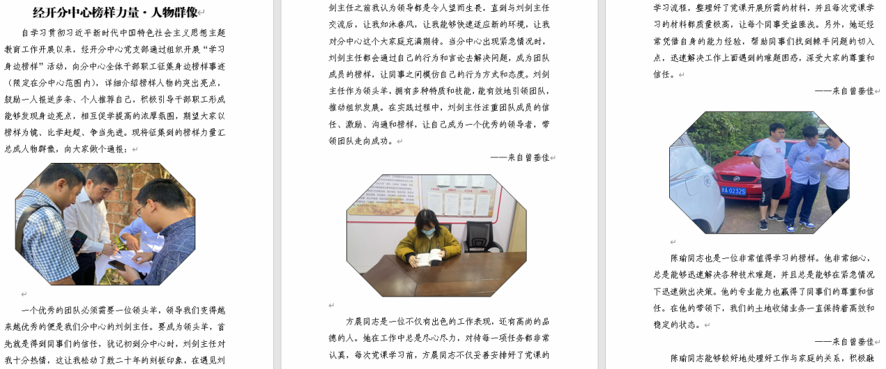 征集到的榜样事迹汇总成一个个鲜活的人物形象,分中心的榜样人物群像迅速生动了起来,“当分中心出现紧急情况时,他都会通过自己的言行去解决,成为团队的榜样,这让我松动了二十年来认为领导都是令人望而生畏的这个想法”,“她经常凭借自身的能力经验,帮助同事们找到棘手问题的切入点,迅速解决工作上遇到的难题困惑”,“他非常细心,总是能够迅速解决各种技术难题,在紧急情况下迅速做出判断”,“他作为非财会专业人员,在分中心缺少财务工作经办人员的时候,能够不计较个人手头工作轻重,在关键时刻主动分担”,“他虽然年纪轻,但踏实肯干,在综合岗位上经办了大量的工作,在防疫创建、排水挂点以及优化营商环境等工作中付出了很多”,“他为完善经开分中心的全生命周期管理系统(二期)档案信息,多次前往新建分中心请教,工作积极主动,为人温暖善良”……