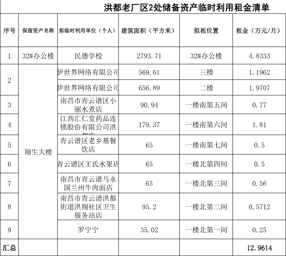 1、拟临时利用用途:原洪都集团翔生机械厂建筑用于商业服务业、办公;原32#办公楼用于教育办公;。