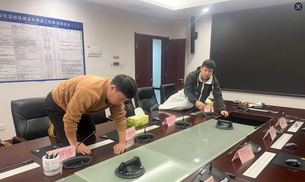 在技术人员的带领下,一是通过检查会议室主控开关和保险丝等是否符合负载要求,是否有烧蚀或接触不良,确保开关功能正常。二是成功解决了会议室演示屏连接笔记本闪屏接触不良、升降屏一体机主板损坏无法正常升降、主板bios电池更换、无线鼠标感应的灵敏度等问题。
